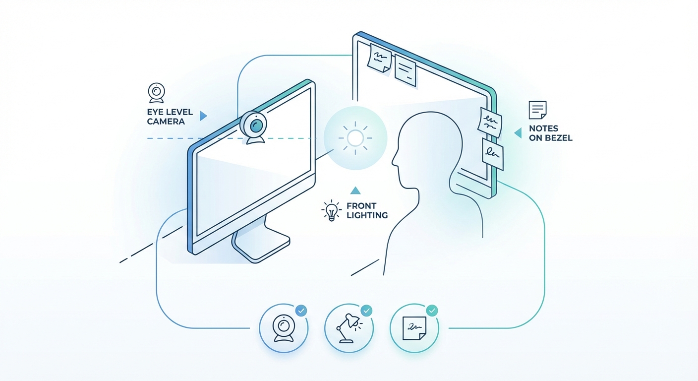 A visual diagram showing the ideal desk setup, including camera placement at eye level, light source positioning in front of the face, and note placement on the monitor bezel