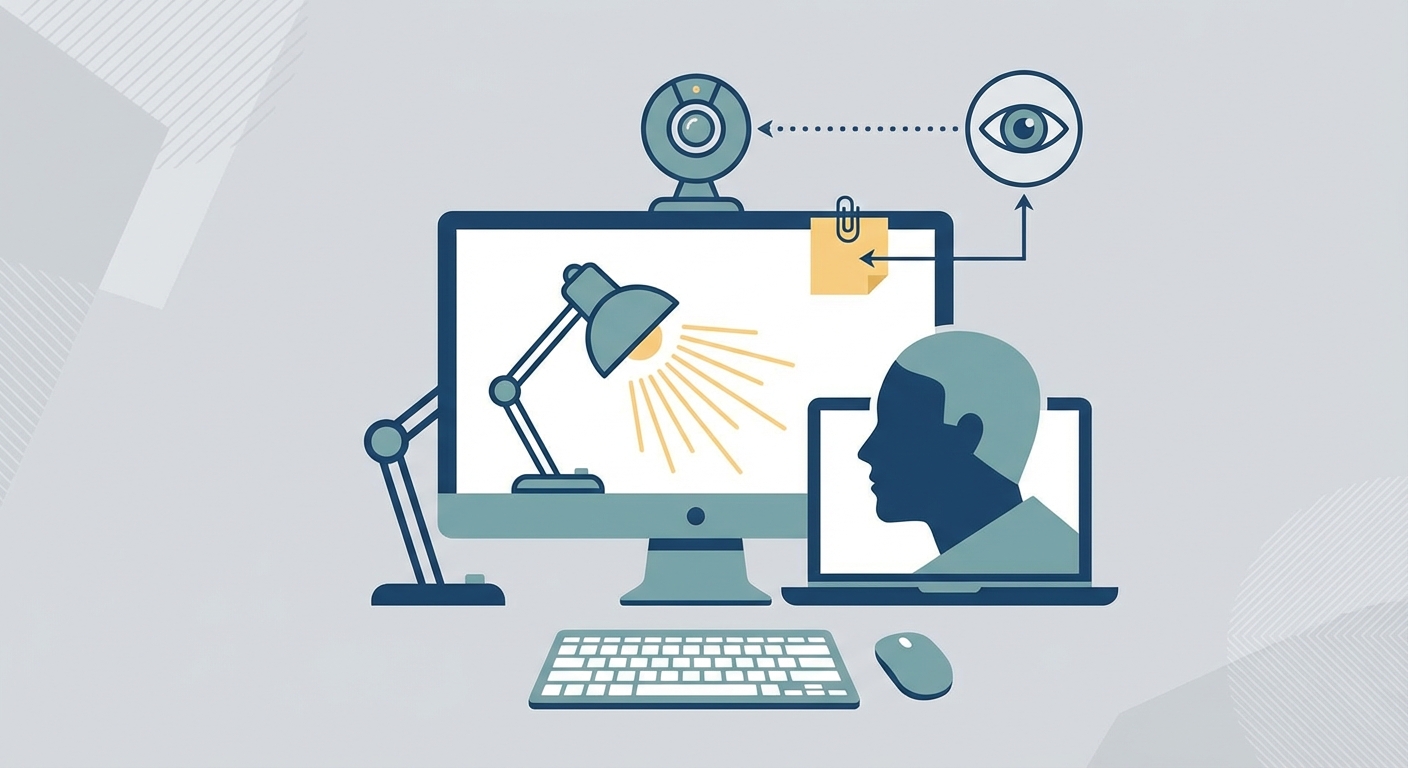 A diagram showing the ideal desk setup, including camera at eye level, light source positioning in front of the face, and a sticky note placement guide next to the webcam.