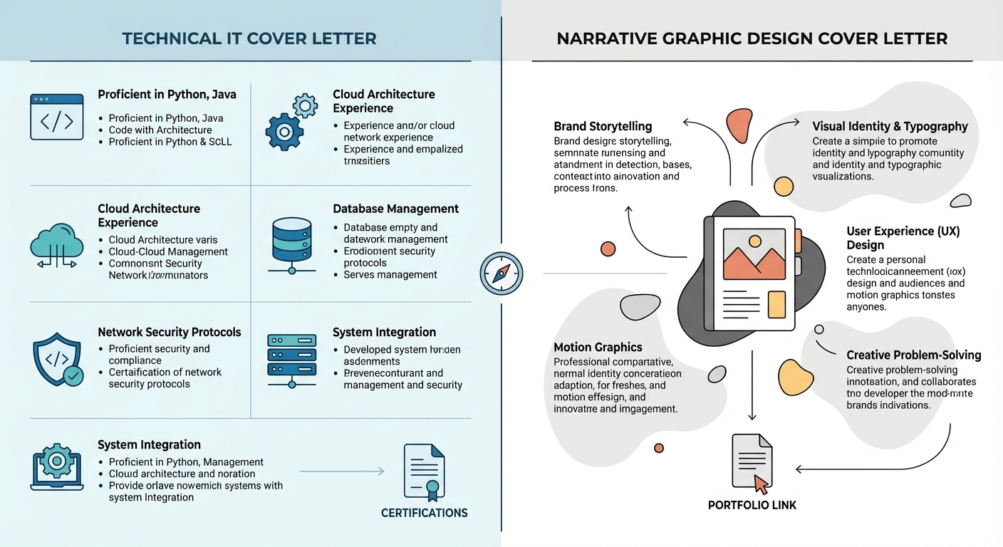 A split-screen visual comparing a highly technical IT cover letter with a colorful, narrative-driven graphic design cover letter, highlighting the distinct vocabulary used in each.