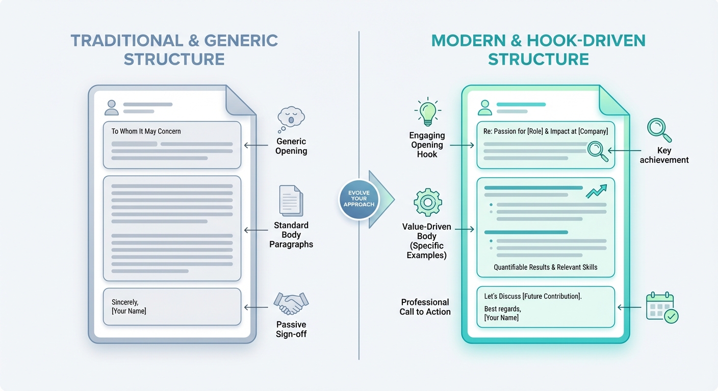 A side-by-side visual comparing a boring, generic cover letter structure against a modern, hook-driven cover letter structure with specific callouts for the opening, body, and sign-off.