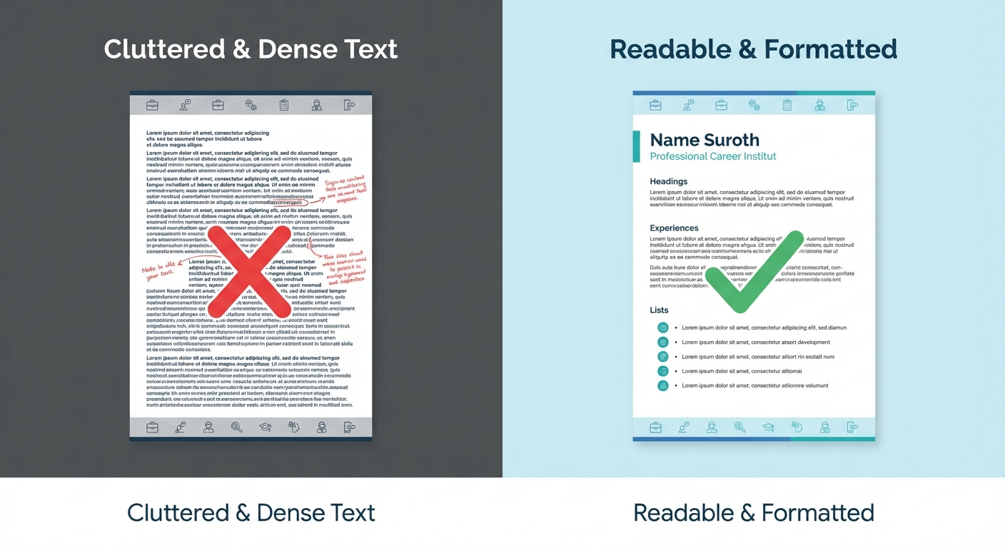 A side-by-side visual comparing a bad, cluttered cover letter full of dense text with a highly readable, perfectly formatted letter utilizing bullet points and plenty of white space.