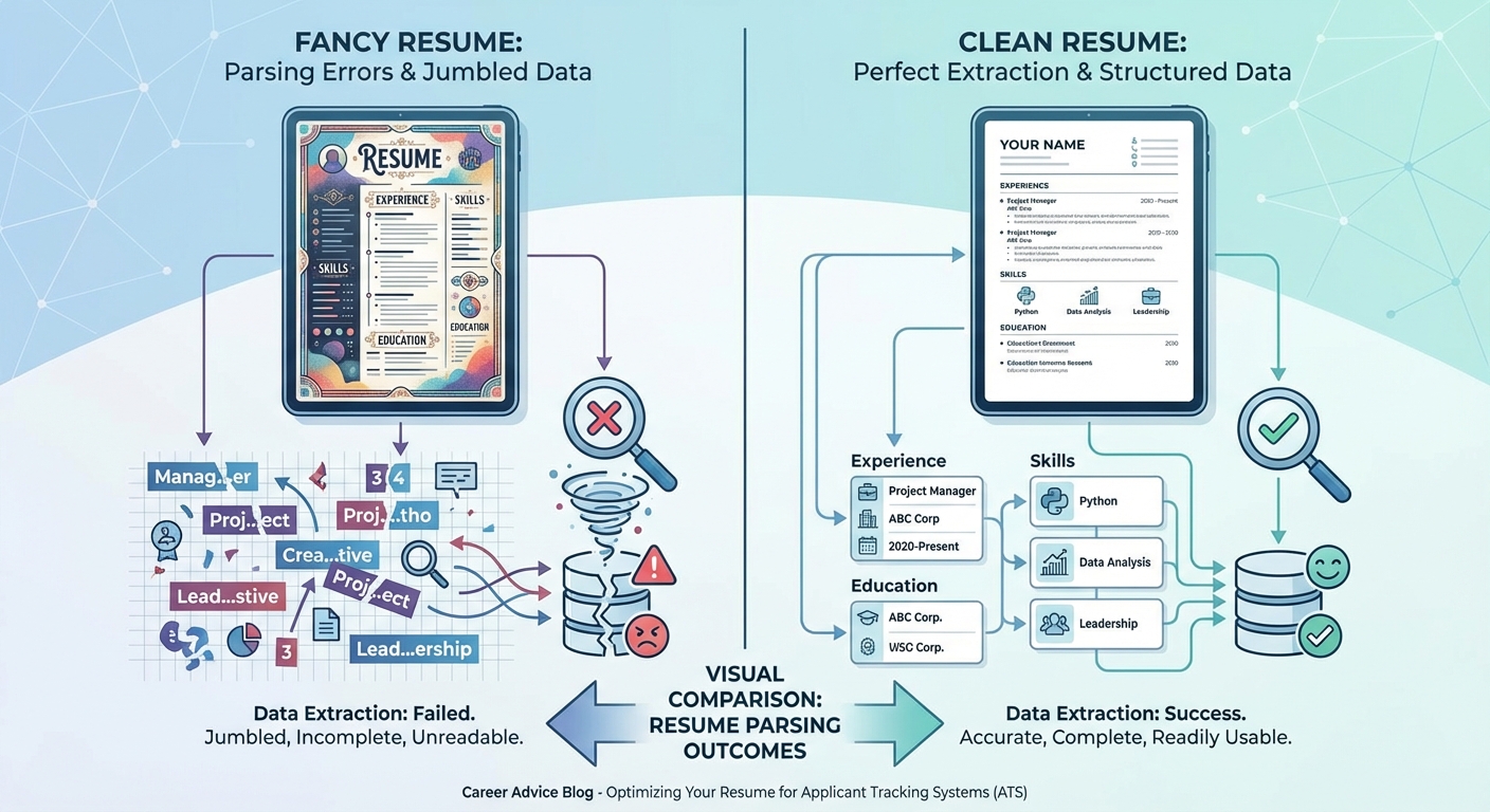 ![Visual comparison showing a 'Fancy' resume with parsing errors [jumbled text] versus a 'Clean' resume with perfect parsing extraction](https://fayvrwhdvhotioocpzeq.supabase.co/storage/v1/object/public/blog-assets/infographic-1766383301559.png)