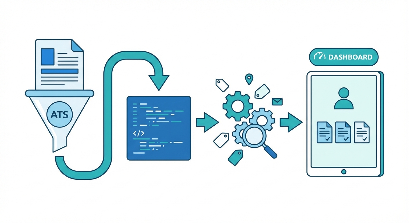 Visual flow chart showing a resume entering an ATS, being stripped to raw text, filtered by keywords, and finally appearing on a recruiter's dashboard