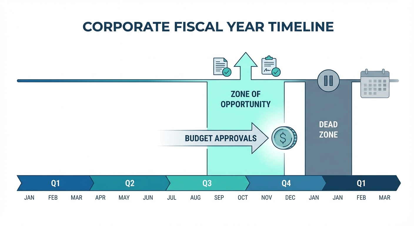 A timeline chart showing a standard corporate fiscal year. It highlights a 'Zone of Opportunity' 3-4 months before annual reviews where budget approvals actually happen, compared to the 'Dead Zone' during the review itself.