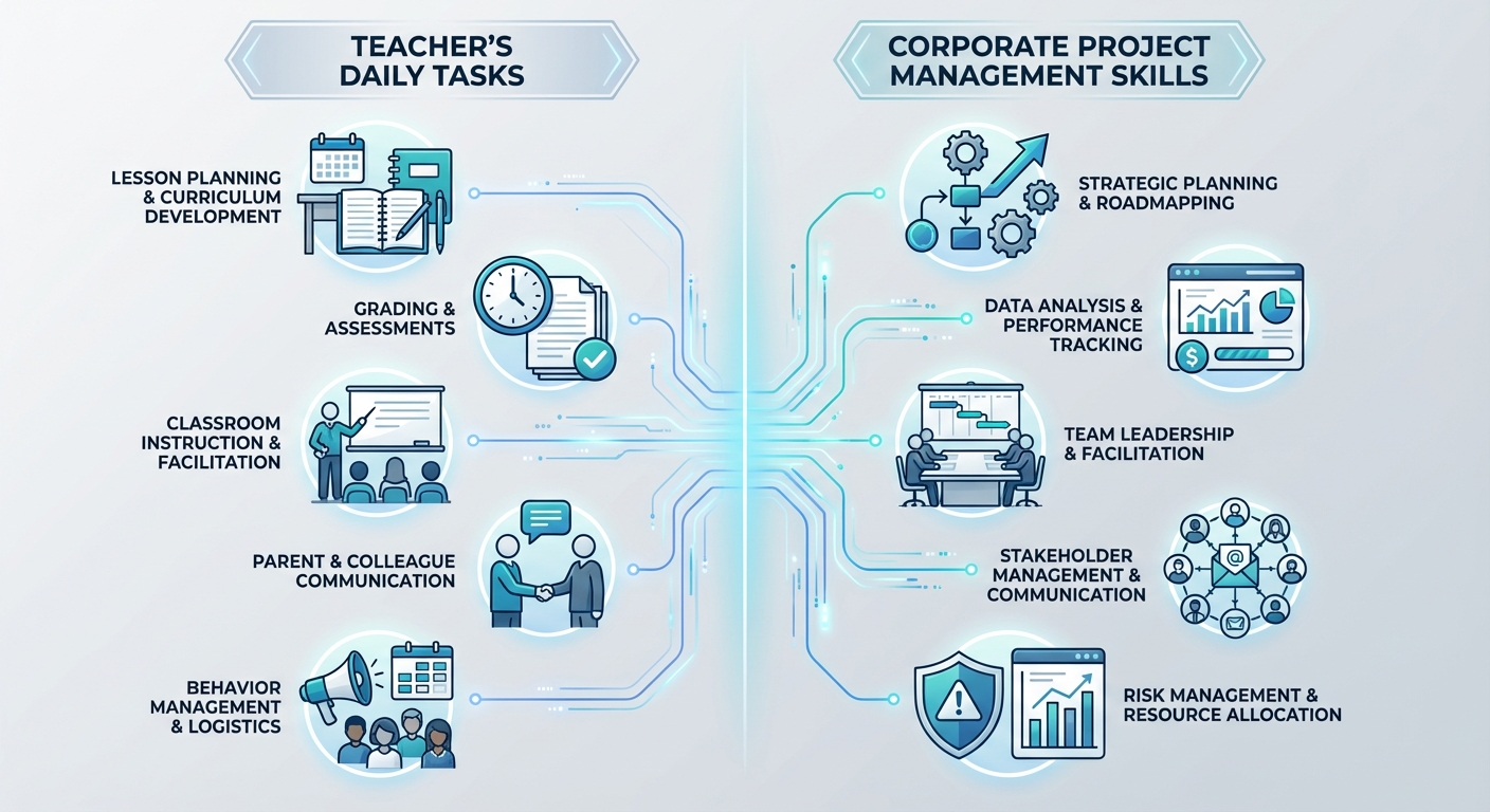 A split-screen visual showing a teacher's daily tasks on the left, with glowing lines connecting them to corporate project management skills on the right.