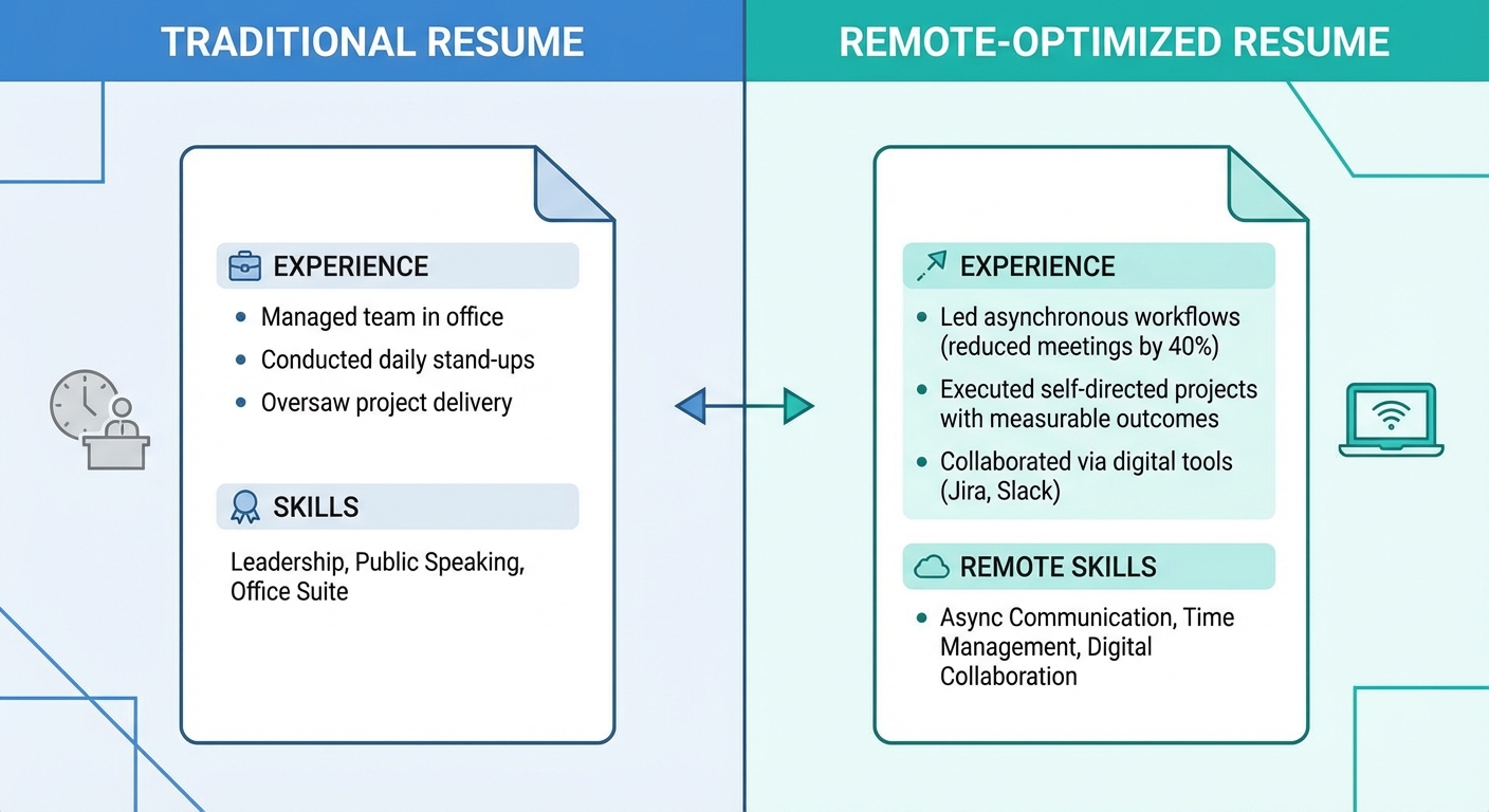 A split-screen visual showing a traditional resume versus a remote-optimized resume, highlighting specific sections where asynchronous communication and self-directed project metrics are emphasized.