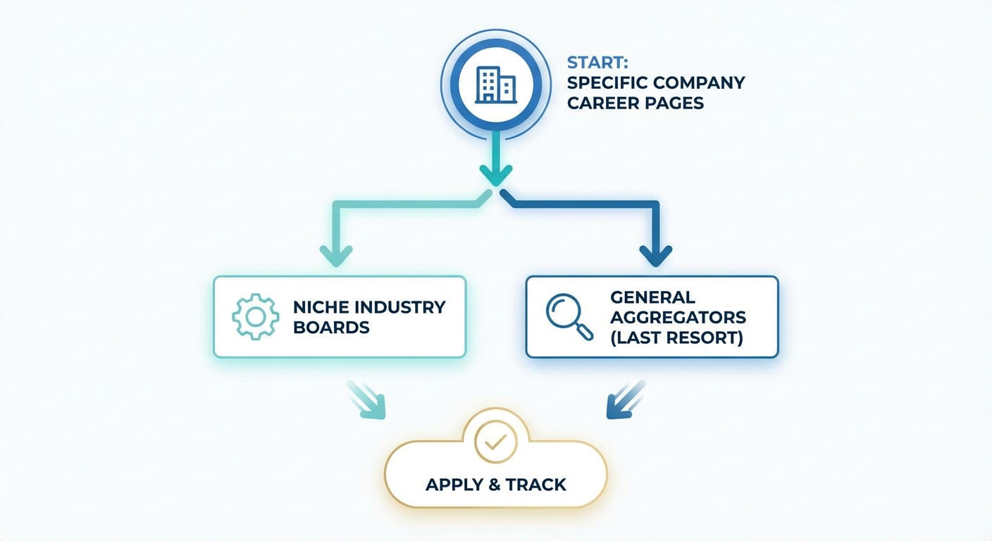 A decision tree flowchart showing 'Where to search' starting with specific company career pages, moving to niche boards, and ending with general aggregators as a last resort
