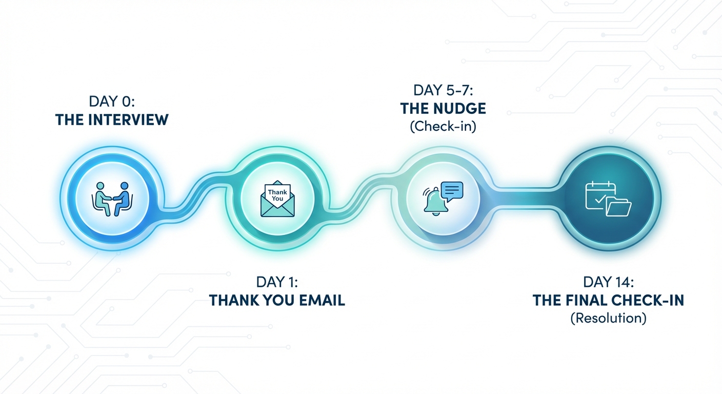 ![A visual timeline showing the ideal follow-up cadence: Day 0 [Interview], Day 1 [Thank You Email], Day 5-7 [The Nudge], Day 14 [The Final Check-in]](https://fayvrwhdvhotioocpzeq.supabase.co/storage/v1/object/public/blog-assets/infographic-1771653706823.png)