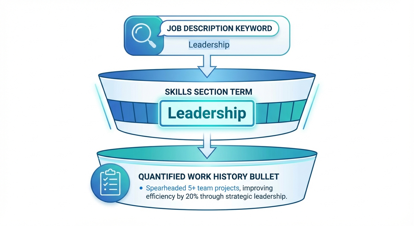 A visual funnel showing how a skill moves from a keyword in the job description -> to a highlighted term in the Skills Section -> to a quantified bullet point in the Work History.