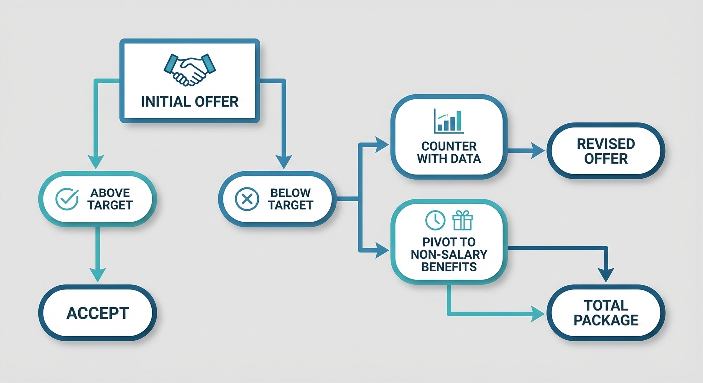 A flowchart showing the decision tree of a salary negotiation. It starts at the initial offer, splits into 'Above Target' and 'Below Target,' and guides the reader through accepting, countering with data, or pivoting to negotiate non-salary benefits like PTO or bonuses.