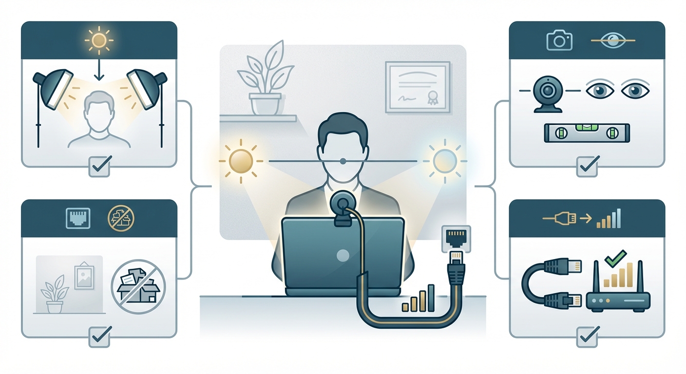 Visual breakdown of an ideal remote interview setup, highlighting lighting placement, camera angle at eye level, neutral background, and wired internet connection