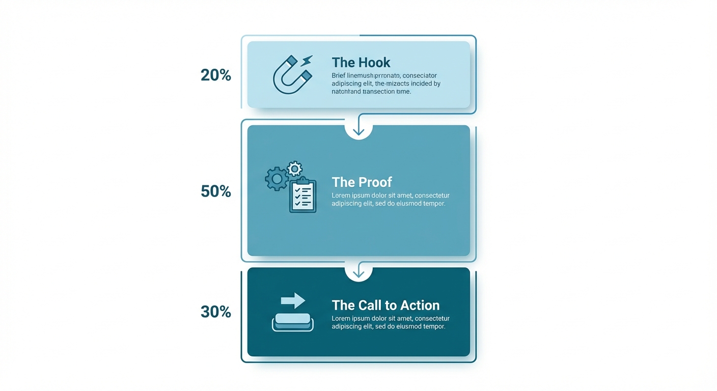A visual breakdown of a cover letter anatomy. Top section labeled 'The Hook', middle section 'The Proof', bottom section 'The Call to Action', showing how much space each should take up on the page.