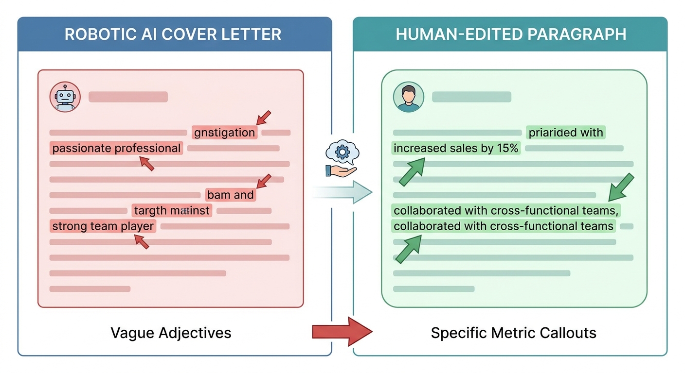 A side-by-side visual of a robotic AI cover letter paragraph highlighted in red with vague adjectives, next to a human-edited paragraph highlighted in green pointing out specific metric callouts and conversational tone