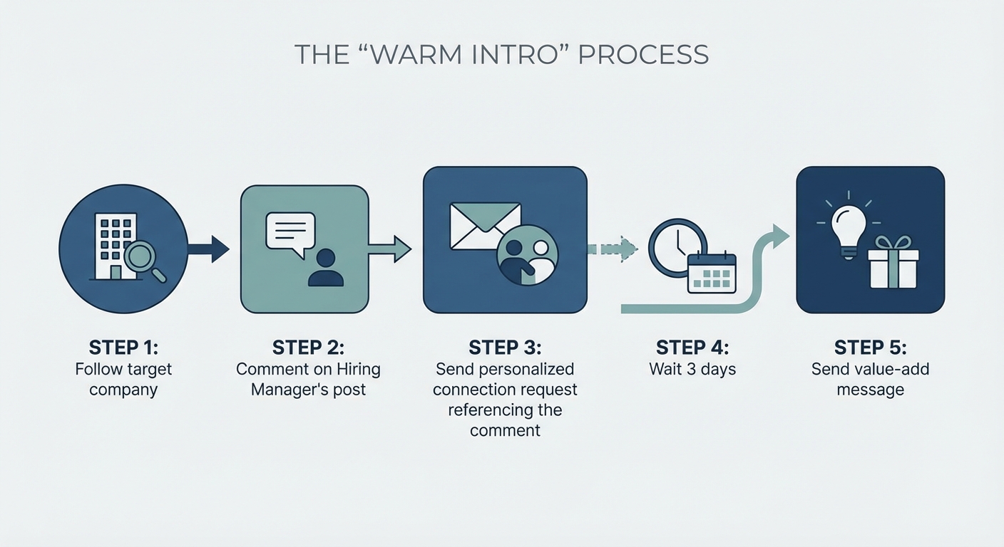 A flowchart showing the 'Warm Intro' process: Step 1: Follow target company. Step 2: Comment on Hiring Manager's post. Step 3: Send personalized connection request referencing the comment. Step 4: Wait 3 days. Step 5: Send value-add message.