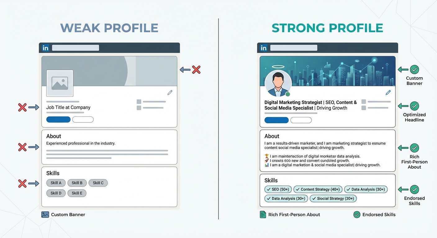A side-by-side comparison of a weak LinkedIn profile versus a strong one, pointing out key areas like the custom banner image, an optimized headline with keywords, a rich first-person about section, and a fully endorsed skills list.