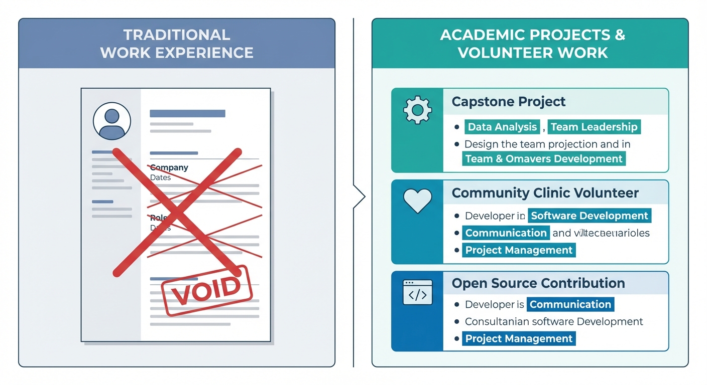 A split-screen visual showing a traditional blank 'Work Experience' section crossed out on the left, compared to a robust 'Academic Projects & Volunteer Work' section on the right, highlighting skill keywords.