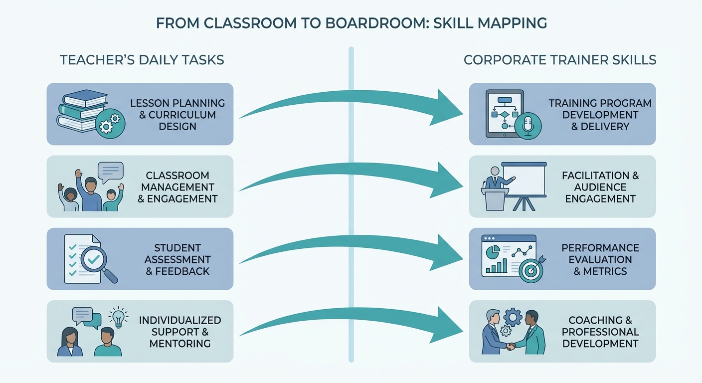 A split-screen visual showing a teacher's daily tasks on the left, mapping directly to corporate trainer skills on the right using connecting arrows.