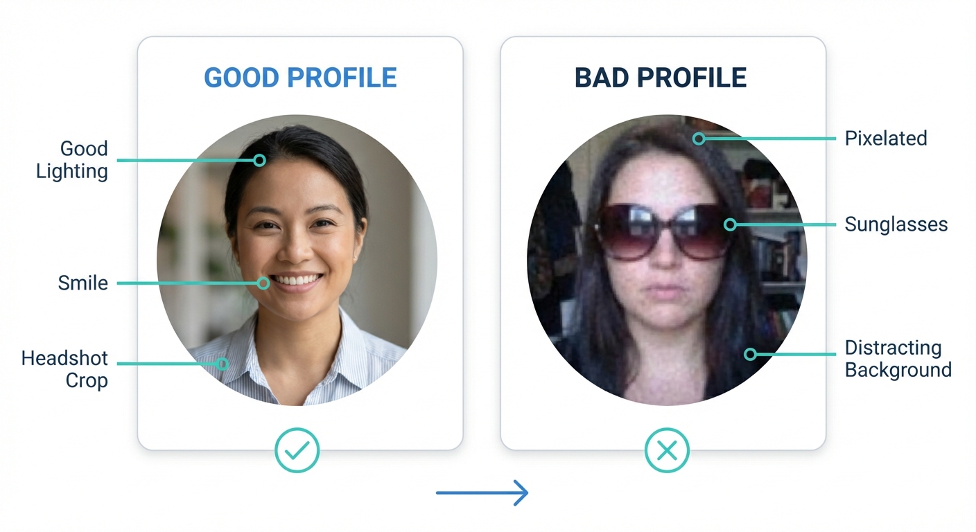 ![A side-by-side visual comparison showing a 'Good' profile photo [good lighting, smile, headshot crop] versus a 'Bad' profile photo [pixelated, sunglasses, distracting background], with callouts pointing to specific features.](https://fayvrwhdvhotioocpzeq.supabase.co/storage/v1/object/public/blog-assets/infographic-1765260152248.png)