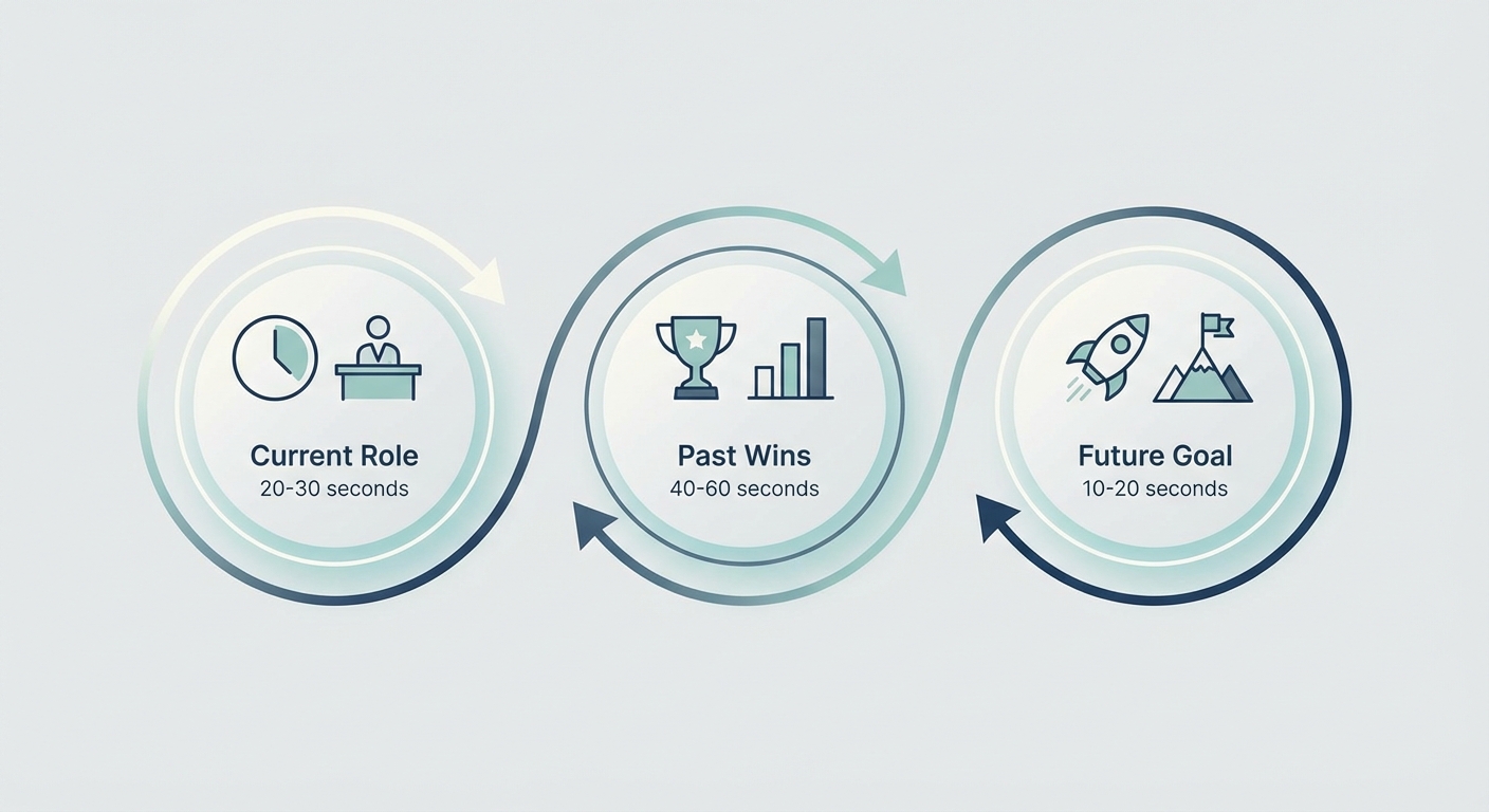 ![A visual timeline showing three bubbles connected by arrows. Bubble 1: Current Role [20-30 seconds]. Bubble 2: Past Wins [40-60 seconds]. Bubble 3: Future Goal [10-20 seconds].](https://fayvrwhdvhotioocpzeq.supabase.co/storage/v1/object/public/blog-assets/infographic-1768888913852.png)