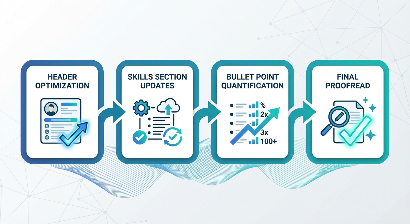 Visual flow chart showing the 'Remote Resume Checklist' - starting from Header optimization -> Skills Section updates -> Bullet point quantification -> Final Proofread