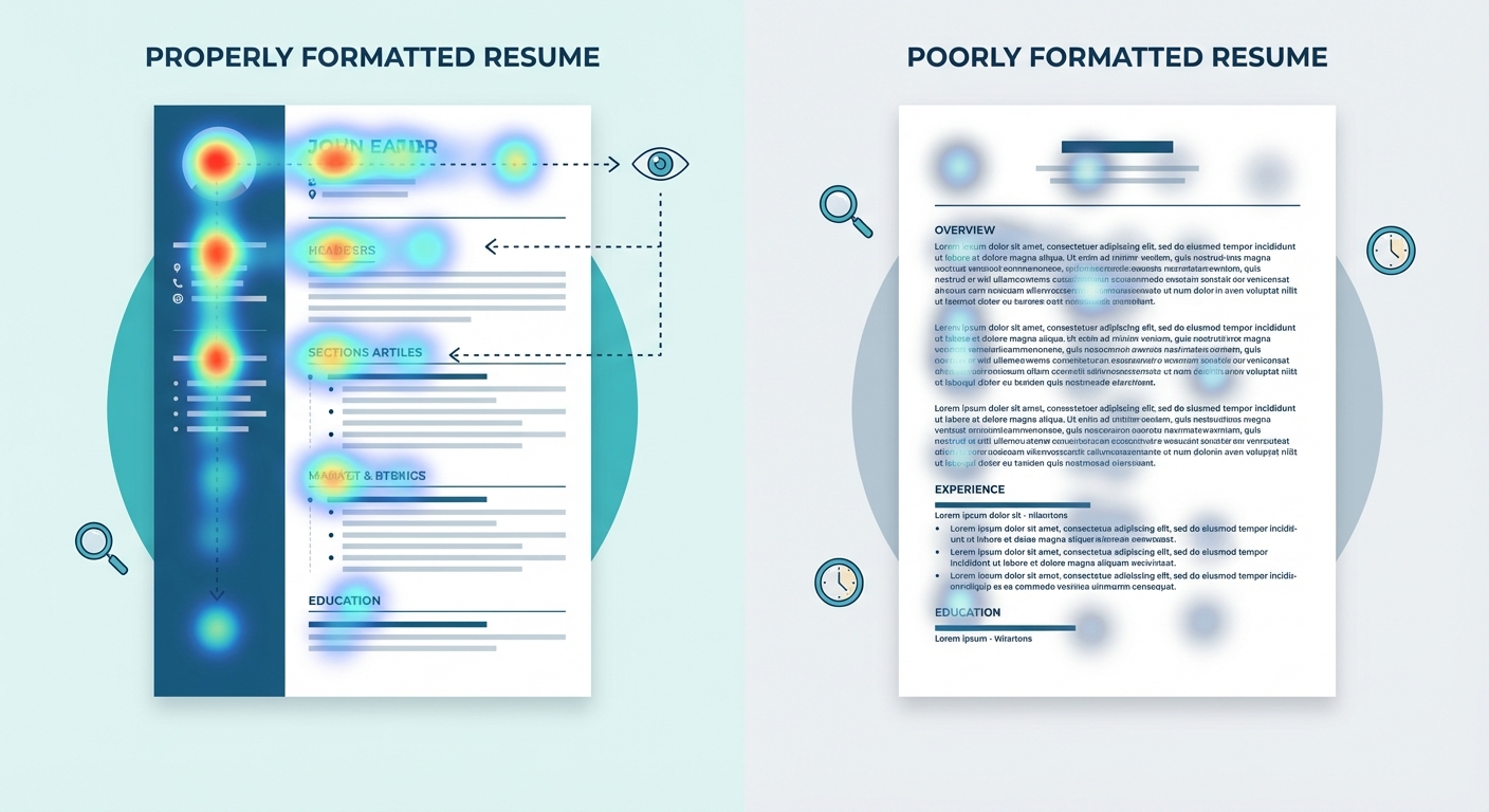 A visual heat map showing where a recruiter's eyes go on a properly formatted resume versus a poorly formatted one, highlighting the F-pattern reading path.