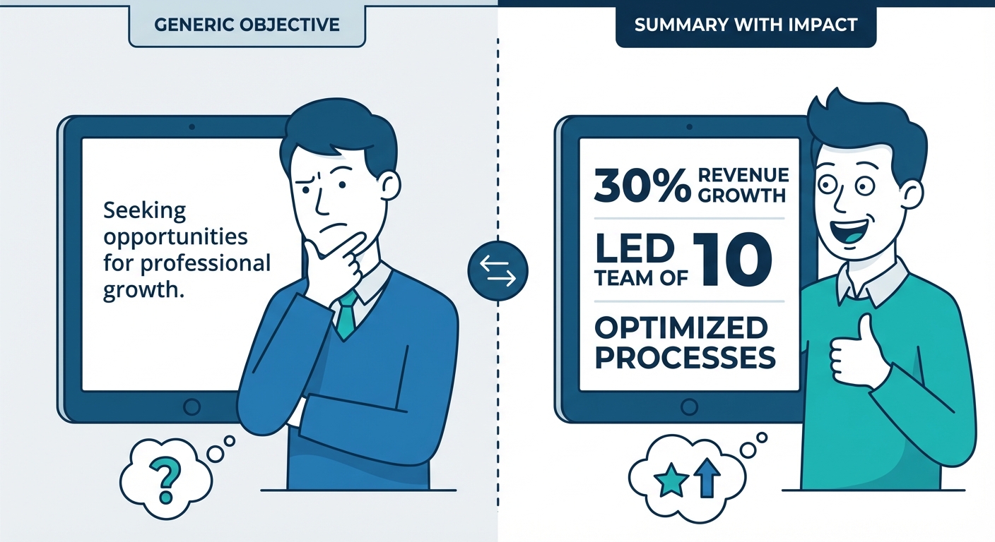 A split-screen visual. Left side shows a puzzled recruiter reading a generic objective about 'seeking opportunities'. Right side shows an excited recruiter reading a summary with bolded numbers like '30% revenue growth'.