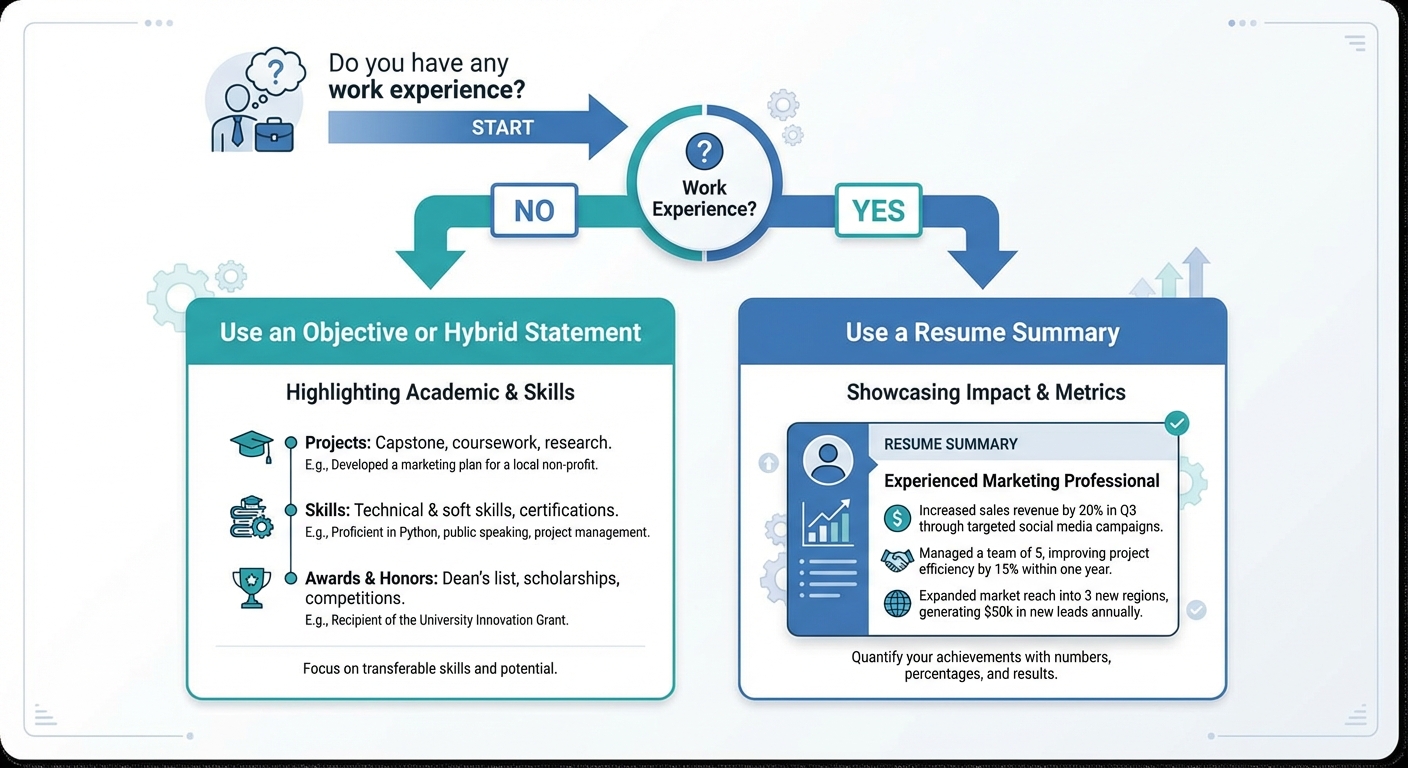 A simple, two-path flowchart. The starting question asks 'Do you have any work experience?' The 'Yes' path points to 'Use a Resume Summary' with a brief example showing metrics. The 'No' path points to 'Use an Objective or Hybrid Statement' with tips on highlighting academic achievements.