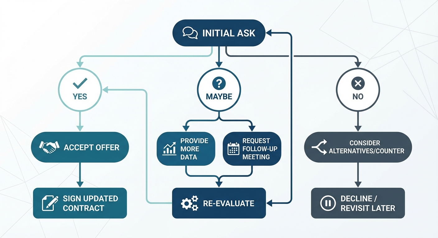 A flowchart showing the step-by-step path of a salary negotiation conversation, starting from the initial ask, branching out to yes, no, or maybe, and ending with signing the updated contract.