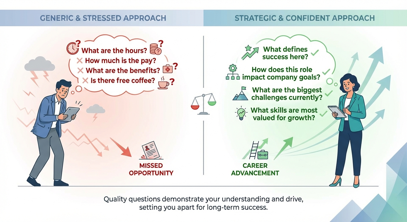 A split-screen visual showing a stressed candidate asking generic questions like 'What are the hours?' on the left in red, versus a confident candidate asking strategic, role-specific questions like 'What defines success here?' on the right in green.