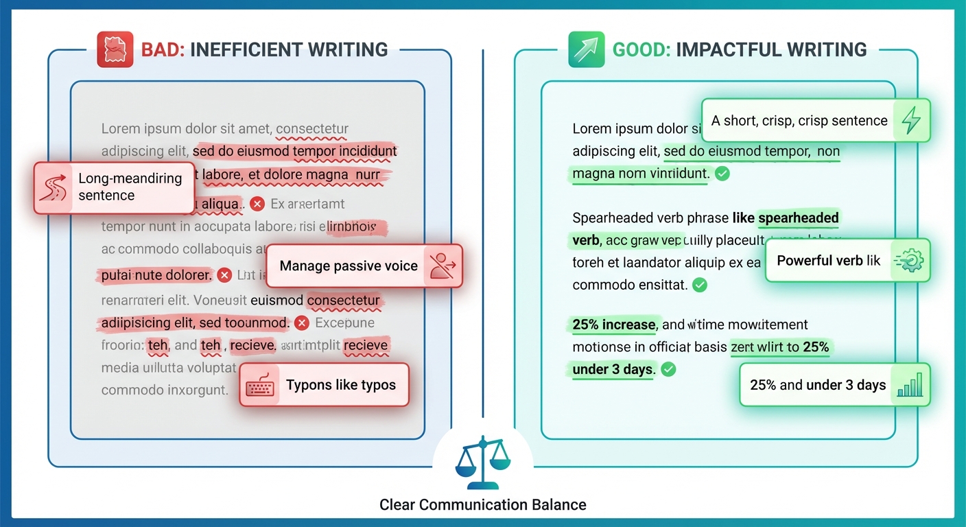 A split screen graphic. Left side shows a 'Bad' paragraph with long sentences, passive voice, and typos highlighted in red. Right side shows the 'Good' version: punchy sentences, active verbs, and specific numbers highlighted in green.