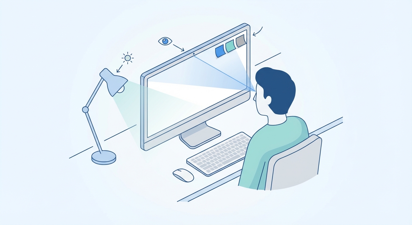 A visual diagram showing the ideal desk setup, including camera height relative to eyes, lighting placement, and sticky note positioning on the monitor