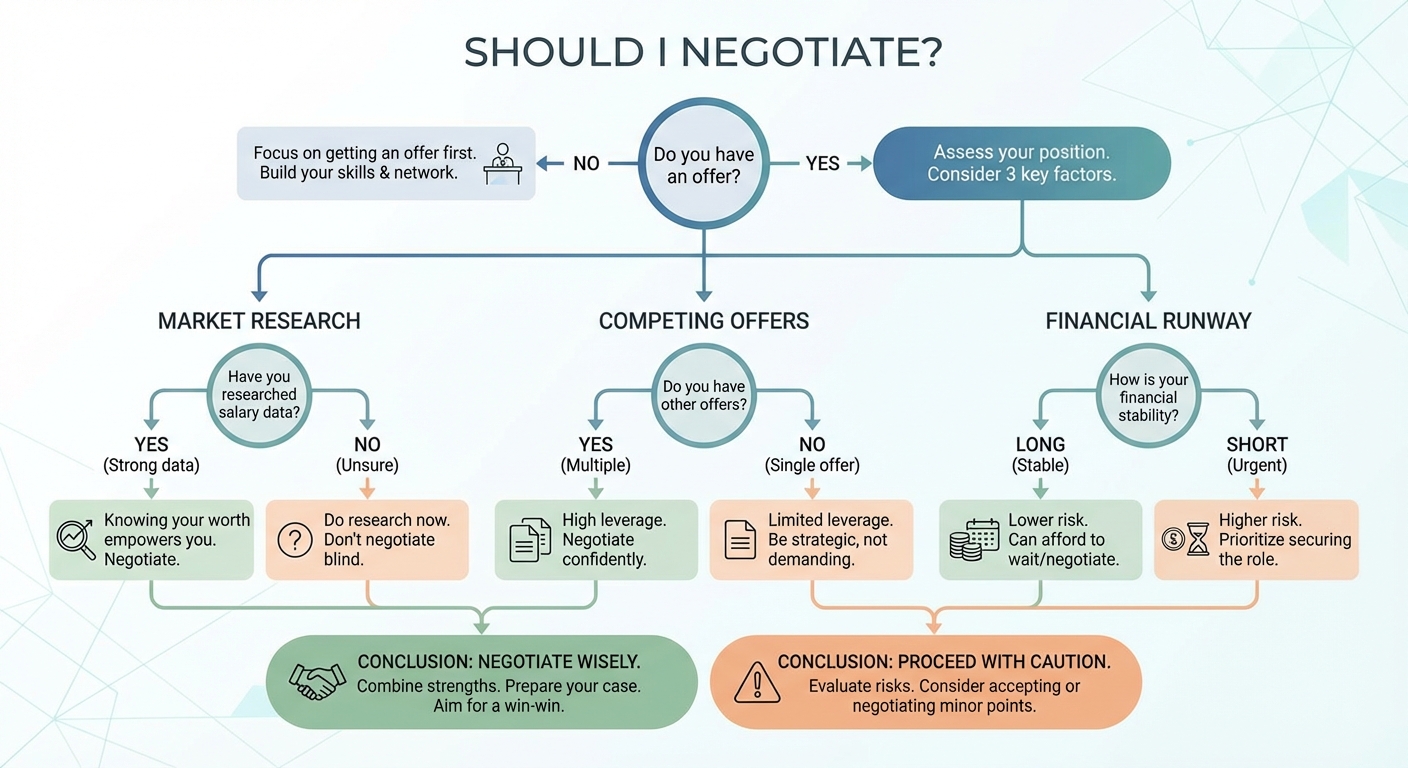 A flowchart titled 'Should I Negotiate?' starting with 'Do you have an offer?' and branching out based on market research, competing offers, and financial runway.
